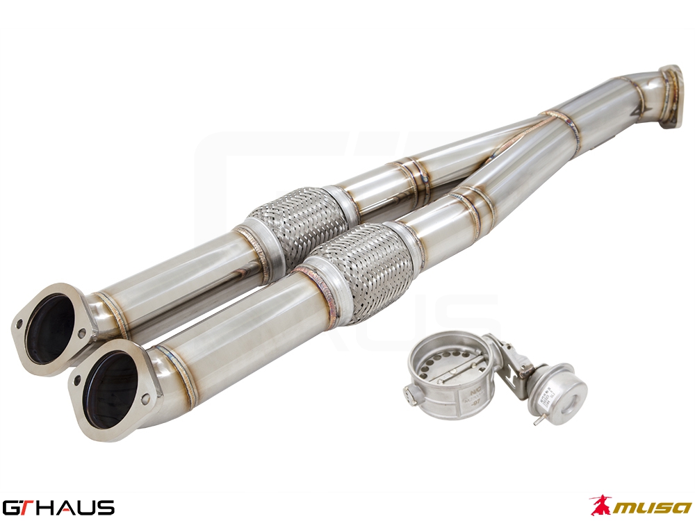 Bolt on mid-pipe section utilizes vacuum actuated valves to control the volume, tone and flow of the exhaust. Removes secondary catalytic converters and replaces stock dummy resonators with Y pipe (straight) to maximize exhaust flow.